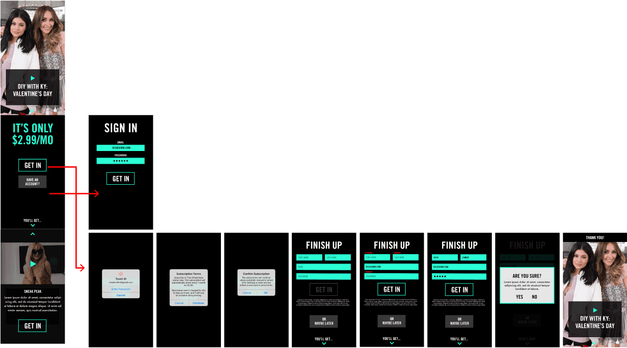 In collaboration with the product team, I designed high fidelity wires to map the user flow for monthly subscriptions when the user taps on a locked piece of content. The goal is for the user to return to their original location after successfully signing in or buying a subscription.
