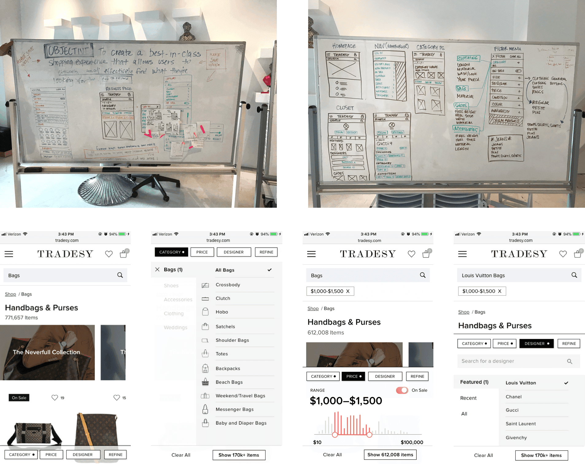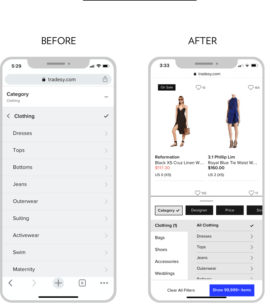 Tradesy has a wide-range of inventory that feels overwhelming to our users (300k+ results on our Louis Vuitton designer page alone), and requires users to have to take several tries with our filtering experience to whittle down their results. The experience is especially cumbersome on mobile.